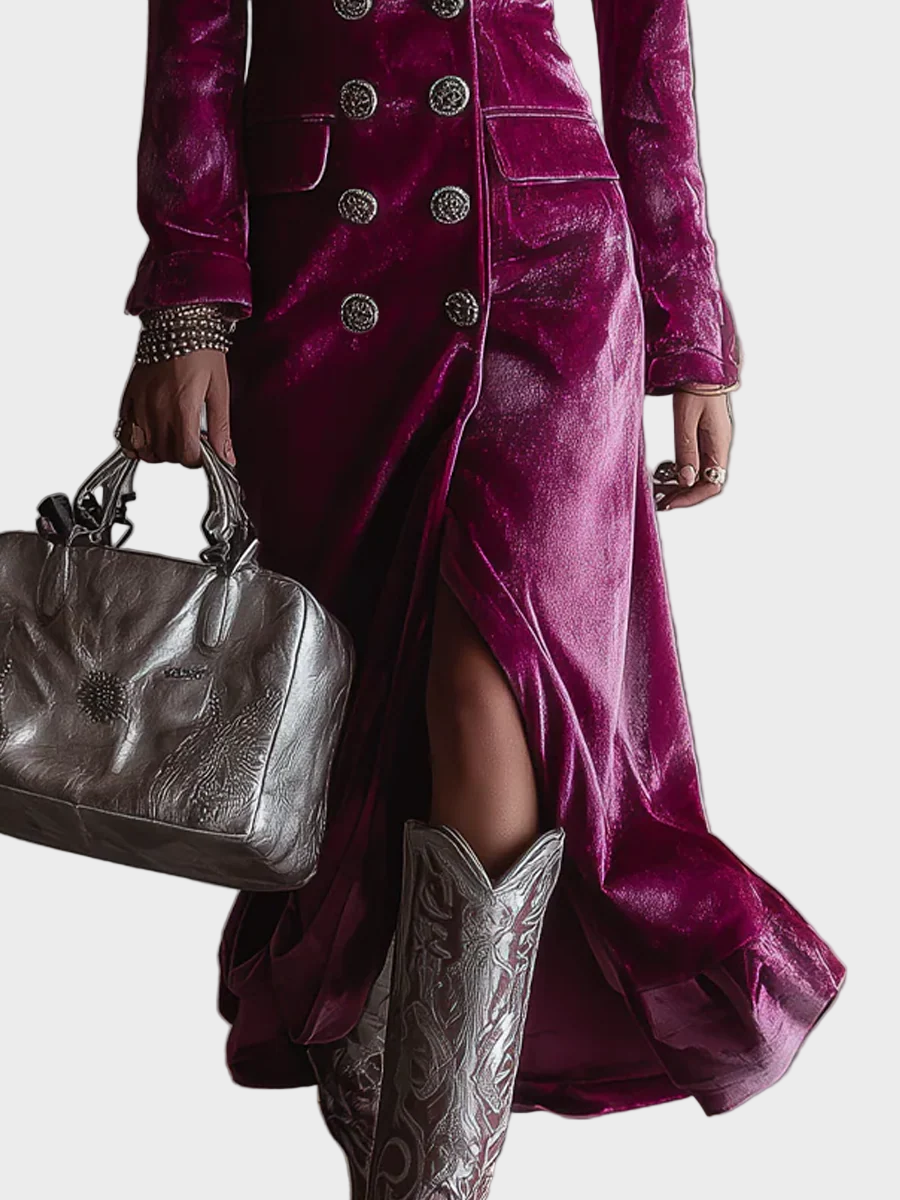 Atrage toate privirile cu eleganță atemporală. Amelia este o rochie sacou lungă, croită impecabil dintr-un amestec de catifea de înaltă calitate, accesorizată cu nasturi cu inspirație vintage și o siluetă fluidă și grațioasă. Umerii structurați și decolteul adânc creează un look îndrăzneț, dar rafinat – o piesă statement instantanee pentru orice ocazie specială.