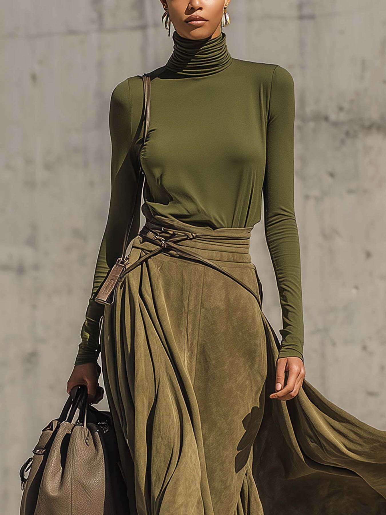 Design: The olive green ensemble pairs a fitted turtleneck with a high-waisted faux piele întoarsă maxi fustă featuring wrap-style draping and tie detailing at the waist.